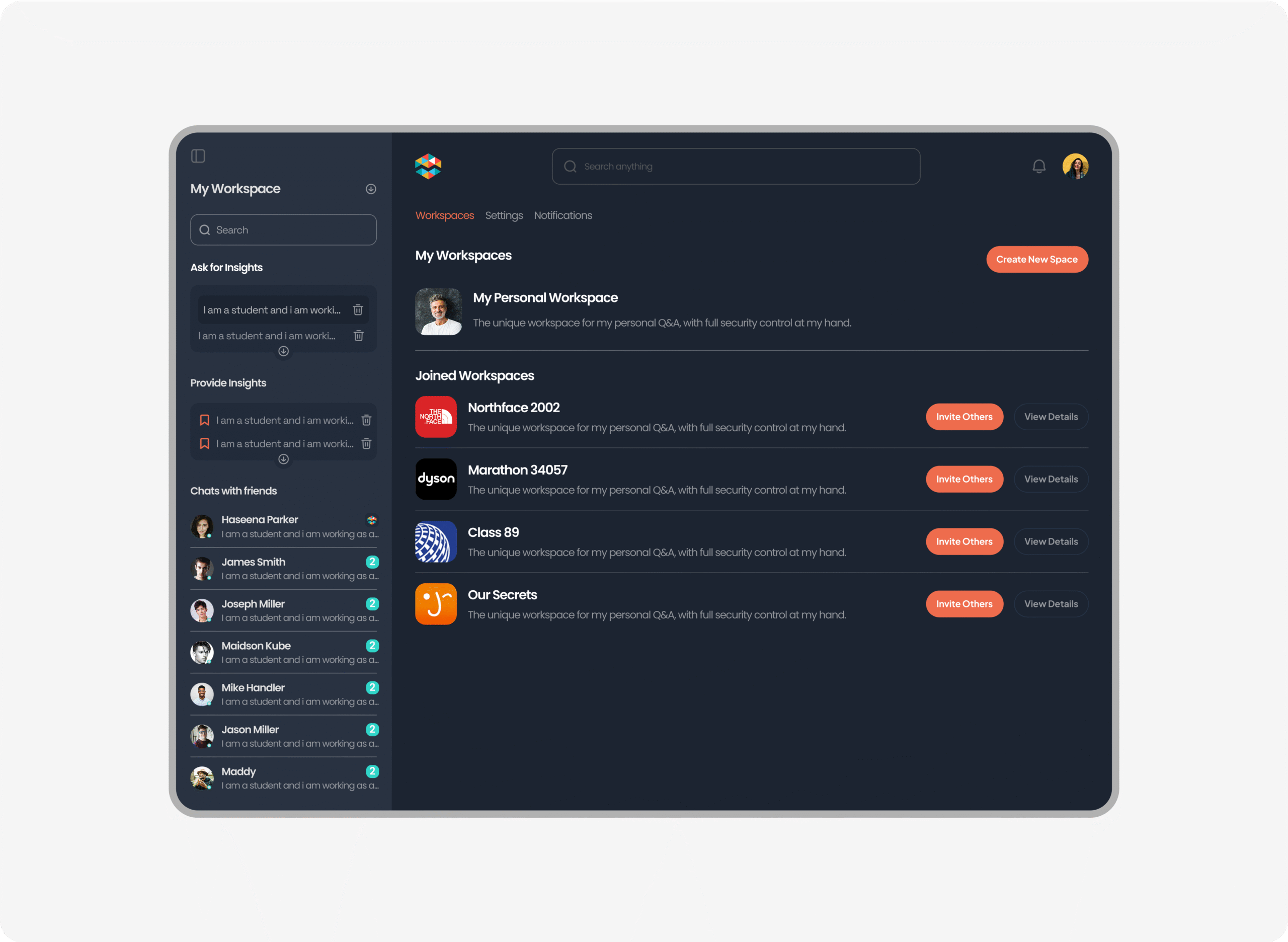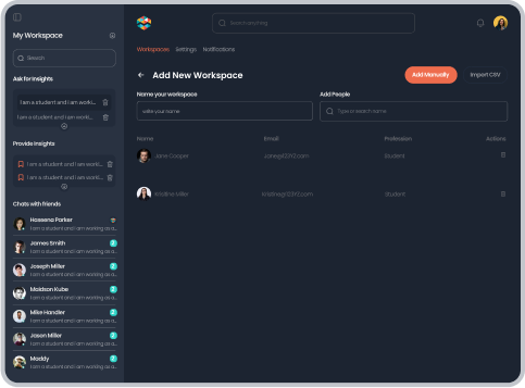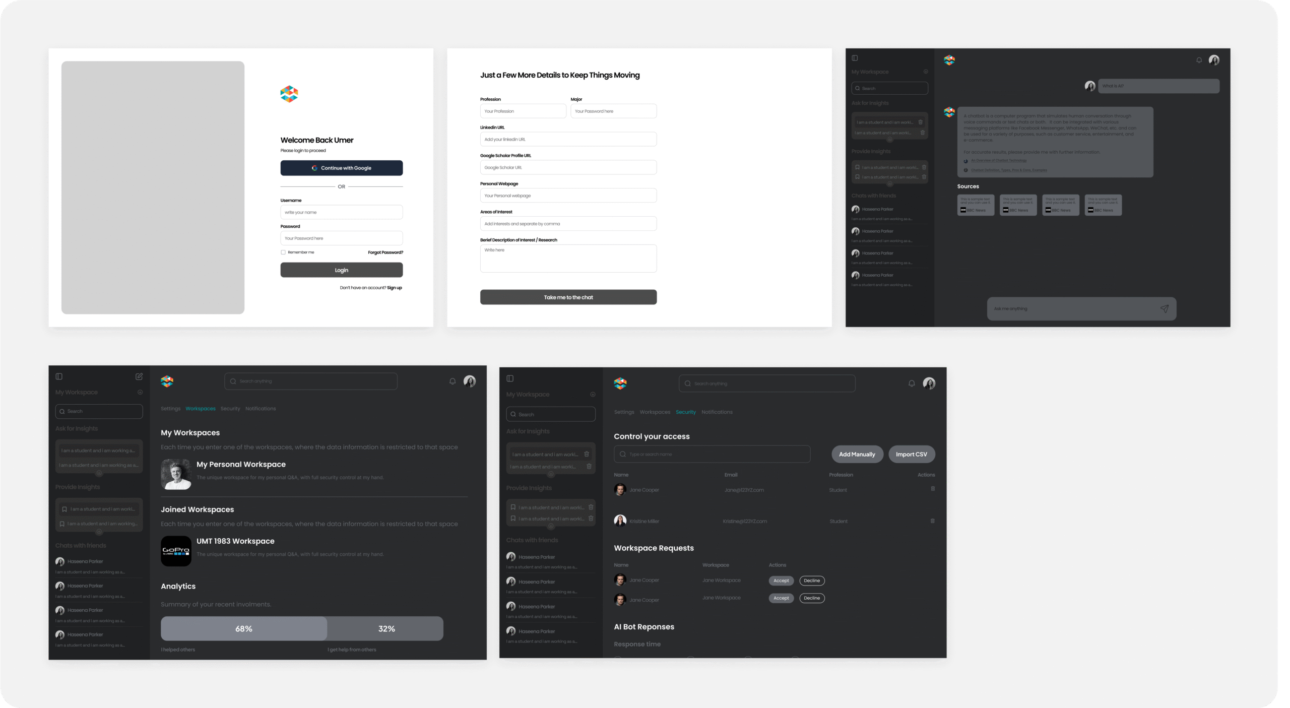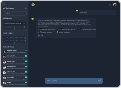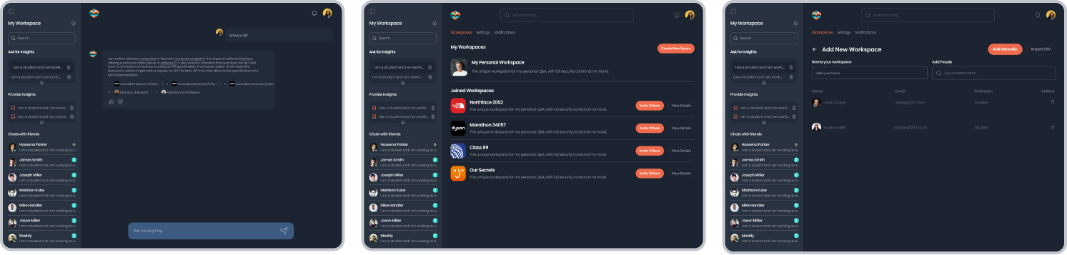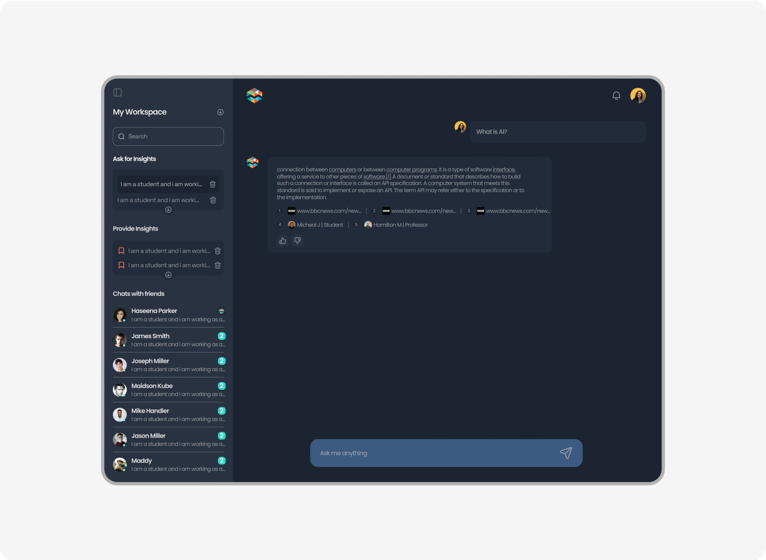 Human AI is a platform designed to help students and teachers collaborate in group workspaces while accessing contextual AI support. From role-based onboarding to chat threads and workspaces, I designed the system architecture, flows, and UI for a clean, scalable MVP experience.